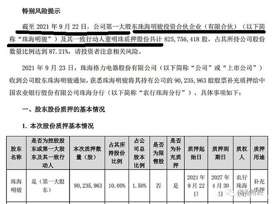 就算加上董明珠,珠海明駿和董明珠合計也只持有格力電器9.46億股 。由此推測,在2021年9月23日這次新增質押後, 珠海明駿手裏可能已經沒剩多少股份可供新增質押的了,一旦珠海明駿可供質押的股份趨於枯竭,引發連鎖 反應,這將是一件危險的事情。
