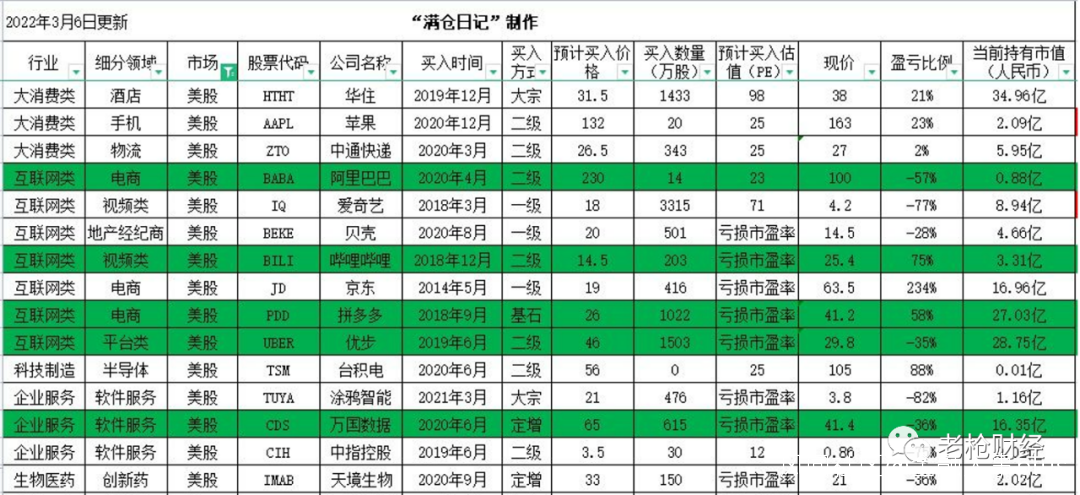 以下是網友整理的截至2022年3月6日高瓴資本在A股、港股和美股市場的部分投資盈虧情況: