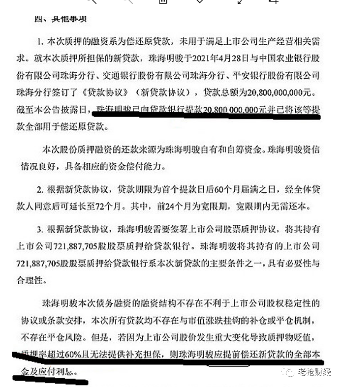 2019 年 12 月,珠海明駿與招商銀行等七家銀行簽訂貸款協議,貸款總額約為 208億元,融資系用於珠海明駿受讓格力集團所持格力電器 15% 的股份,同時珠海明駿將其所持格力電器股票也質押給貸款銀行,作為貸款的主要條件之一。
