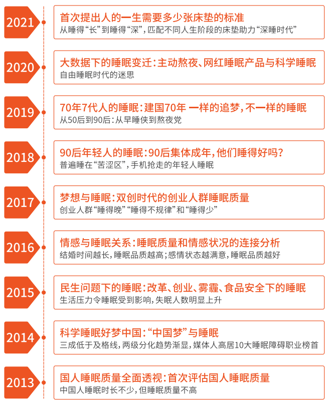 這也是為什麼,喜臨門一直聯合權威機構,連續9年發佈了中國人的睡眠指數報告,不斷對大眾科普相關知識,加深人們對健康睡眠的認知。比如在《2021喜臨門中國睡眠指數報告》中,喜臨門研究後提出了“人的一生需要睡8張牀墊”,這是針對深度睡眠的解決方案之一,也是全球首個牀墊更換標準。