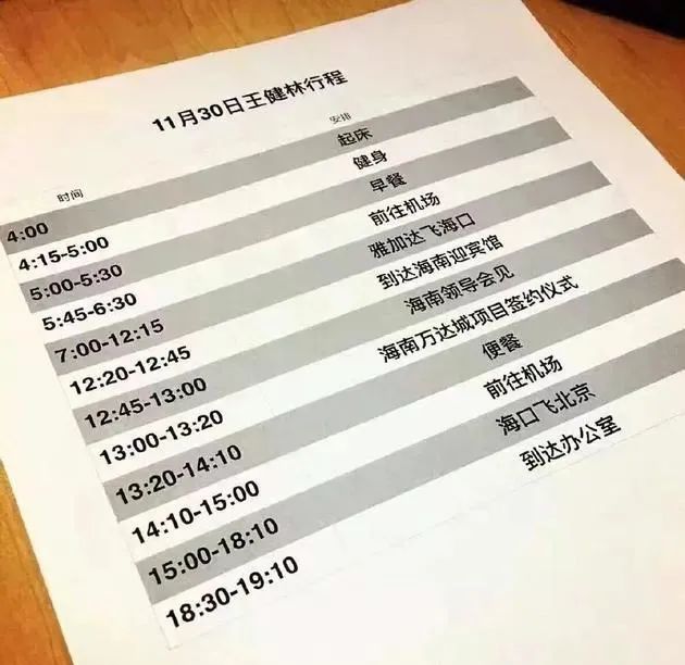2016年,網上瘋傳過一張王健林的行程單,行程單上顯示,他凌晨四點就要起牀,一天之內飛了兩個國家三座城市。