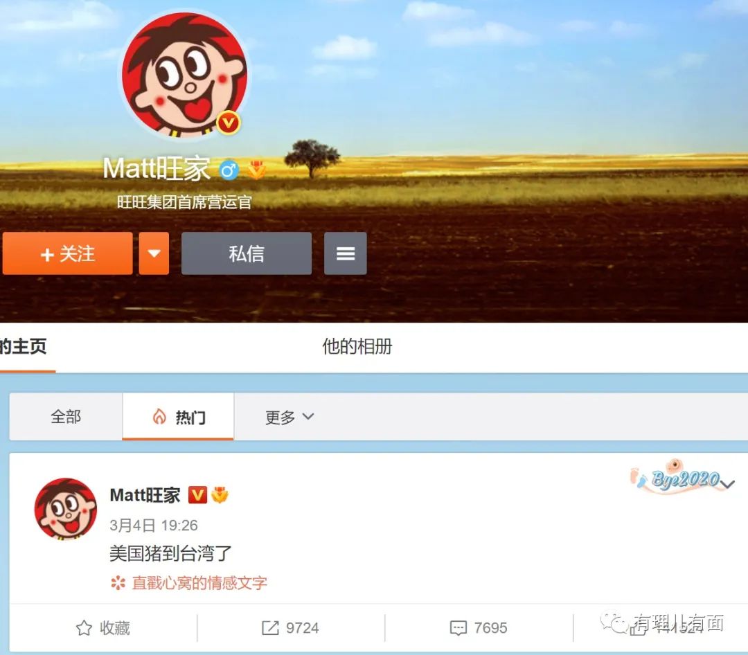 3月4日,台灣省著名企業旺旺食品在其官方微博平台發佈貼文:“美國豬到台灣了”。正所謂字越少事越大,短短七個字一語雙關,道盡了島內民眾對美國的不滿。