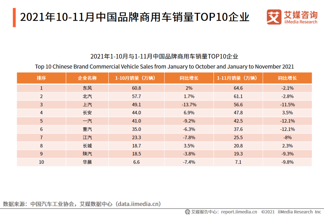 **可以確定的是,國內汽車市場的格局幾乎很難再發生實質性的改變,**單就中國品牌而言,艾媒諮詢顯示,在2021年前十個月裏,各汽車品牌在國內市場的銷量排名無明顯變化,東風汽車始終佔據首位,前十一個月累計銷量達到64.6萬輛,其次為北汽、上汽、長安和一汽,1-11月累計銷量均在40萬輛以上。