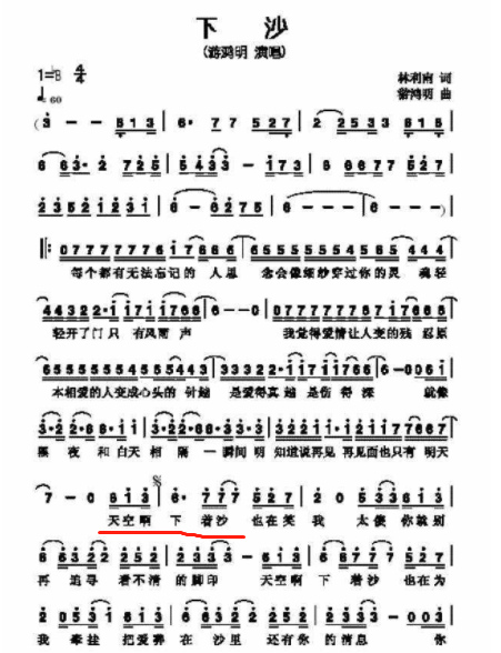 游鴻明的《下沙》,最有記憶點的副歌第一句,4個音就寫出來了,整個副歌段落也基本都是重複第一句的節奏: