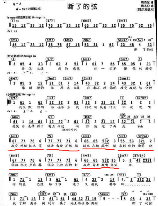 《斷了的弦》,最好聽抓耳的部分是過渡段“我突然釋懷的笑”那部分,每一句幾乎也都是3個音就寫成了,而且節奏高度一致: