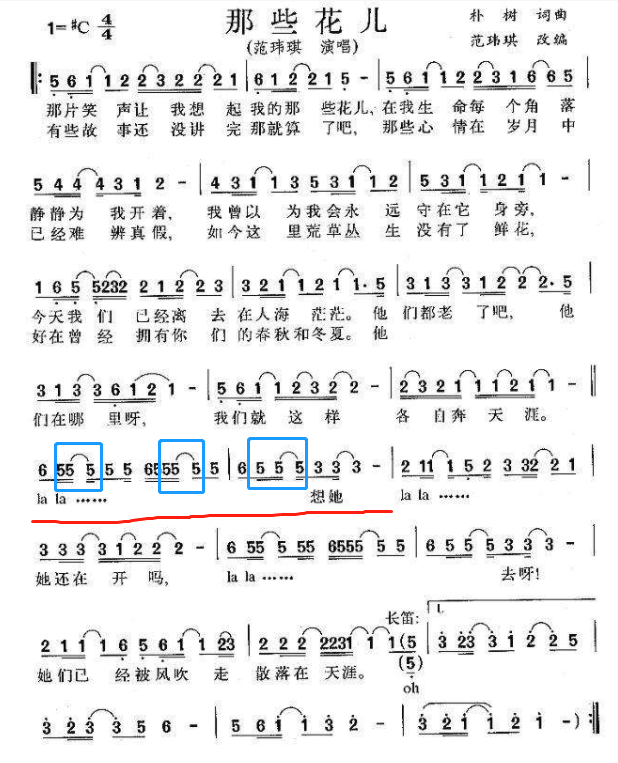 朴樹的《那些花兒》,經典的“啦啦啦”,組成音只有3、5、6這3個,節奏也是十六分+切分音的重複使用: