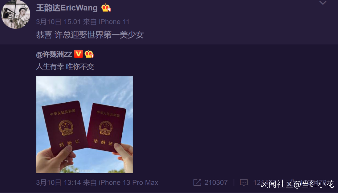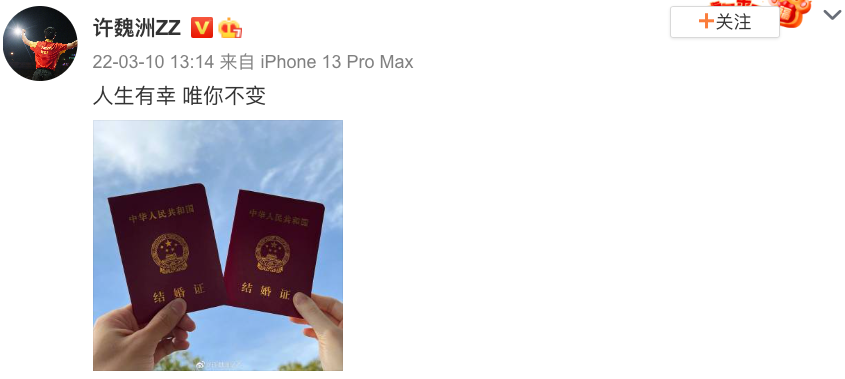 人家小兩口結婚,這位不知名男閨蜜比當事人還高調,下午轉了許魏洲的官宣博送了祝福,沒引起注意。