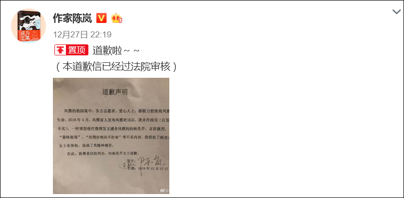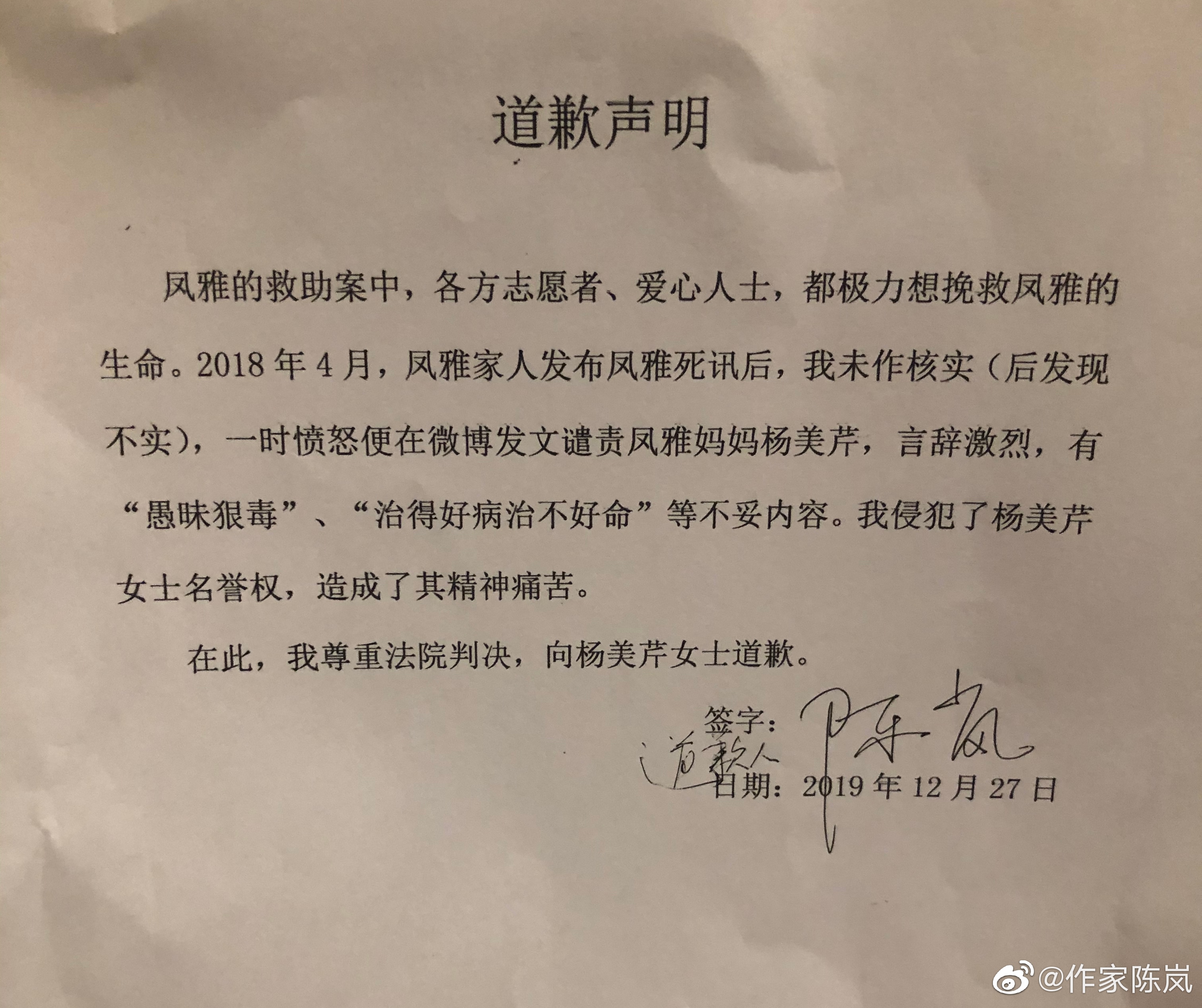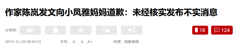 當年觀網上的相關報道:《作家陳嵐發文向小鳳雅媽媽道歉:未經核實發佈不實消息》