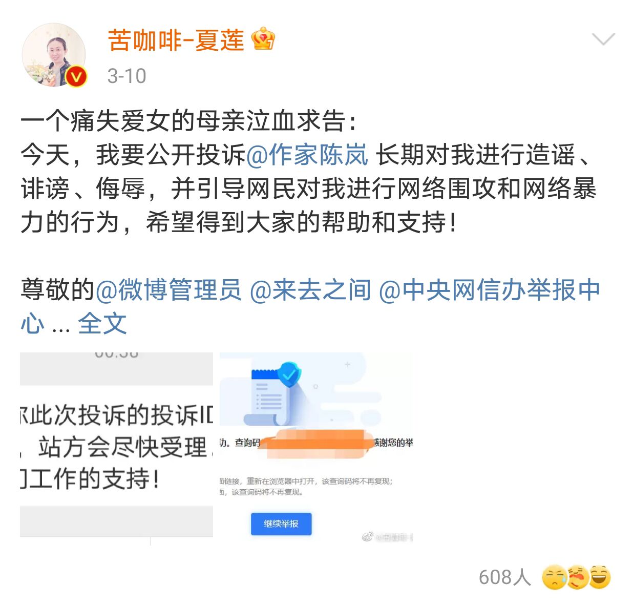 同時,她準備正式投訴陳嵐對其長期造謠和誹謗,引導網民對其進行網絡暴力。