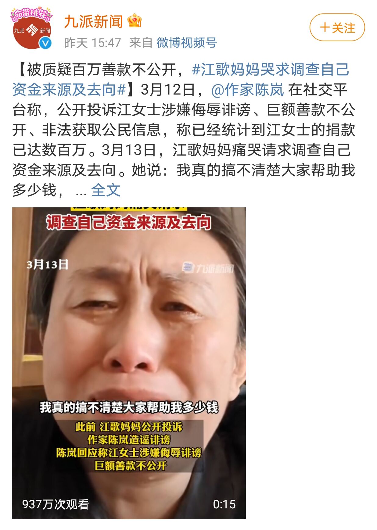 因為被質疑百萬捐款來源不公開,江歌媽媽哭求調查自己的資金來源……_風聞