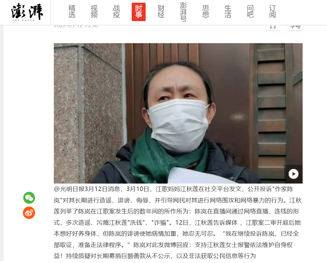 澎湃新聞的相關報道:《江歌母親回應公開投訴陳嵐誹謗:已取證,準備走法律程序》