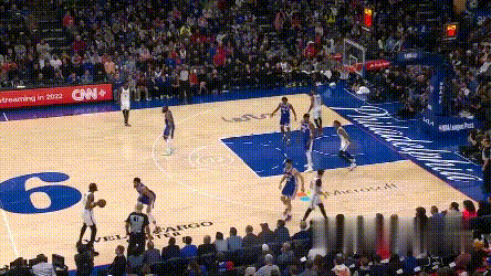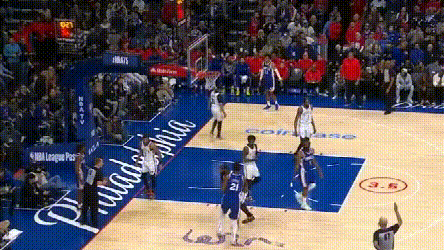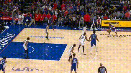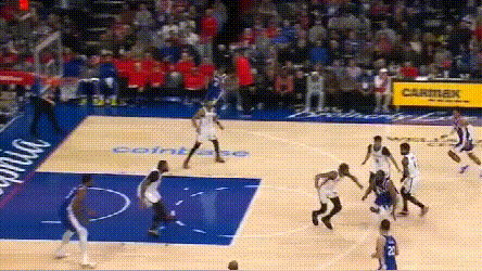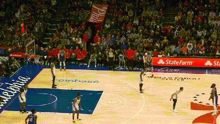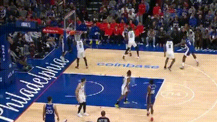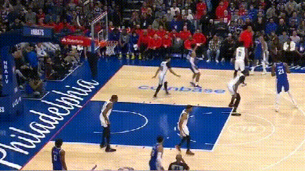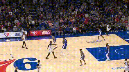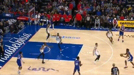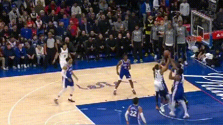 **問題在於,76人協防價值高的球員都用來防持球人了,**靠哈登補籃下就得看運氣如何。四哥兩次都頂着哈登完成終結,76人也沒脾氣。