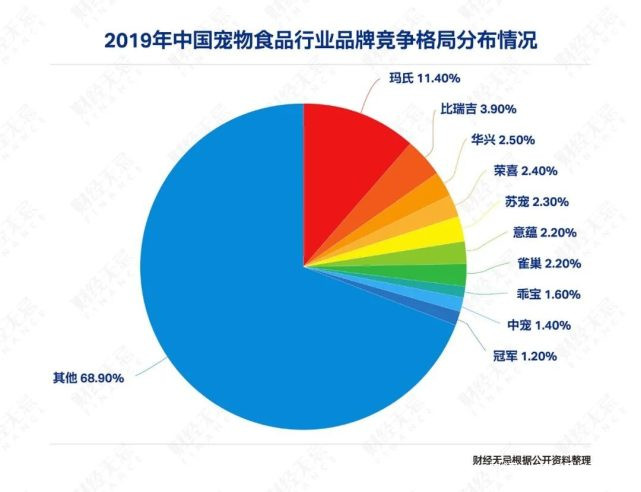 據《2020年中國寵物行業白皮書》顯示,目前國內寵物食品市場,瑪氏佔據龍頭地位,市場份額佔比為11.4%,其他品牌市場份額佔比均在5%以下。