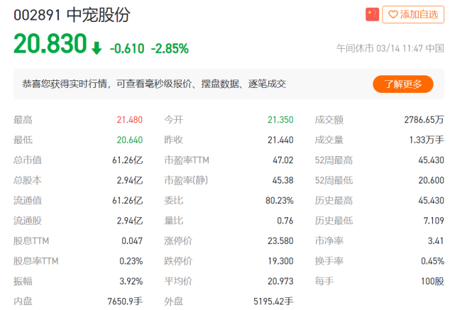 遺憾的是,高成長性是屬於行業的,但卻並不屬於如今二級市場上的寵物食品概念股。中寵股份(002891.SZ)與佩蒂股份(300673.SZ)都在不同程度上經歷着淨利下滑、增速放緩與自主品牌突圍難等問題。以中寵股份為例,這一在寵物食品市場縱橫二十餘年的老牌企業其股價距離高點近乎腰斬。