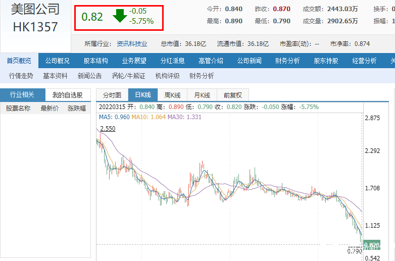 美圖當前的問題,或許已經轉變為市場還有多少耐心。截至2022年3月15日,美圖股價來到最低點,收盤價僅0.82港元,總市值36.18億港元,與曾經千億市值的輝煌形成鮮明對比。