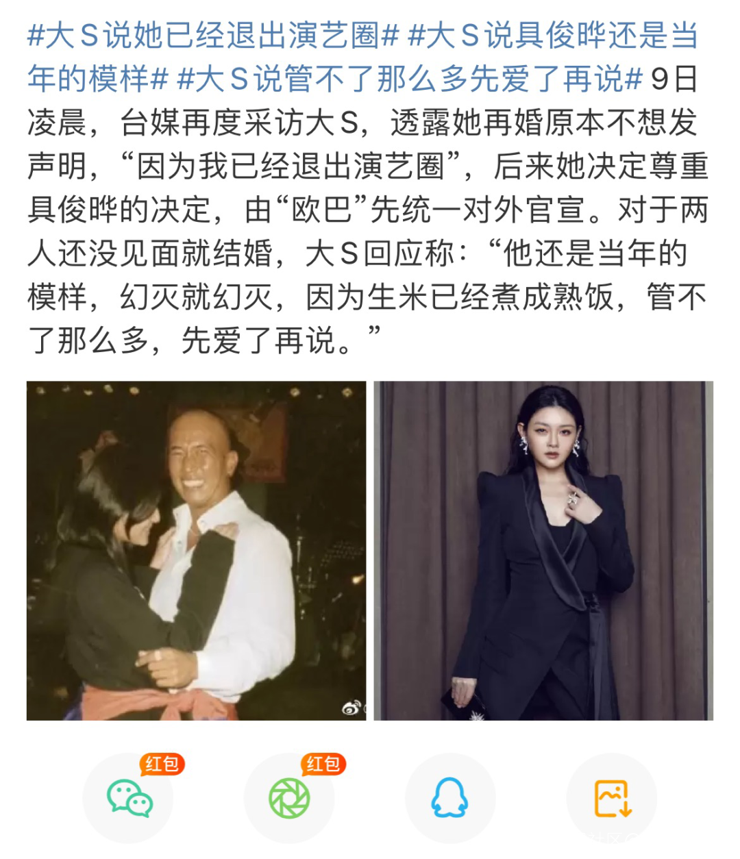 “生米已經煮成熟飯,管不了那麼多,先愛了再説。”日前連續兩天,輿論熱點始終被大S再婚的消息佔據,之後大S“退出娛樂圈”和“先愛再説”的情感宣言,再度將其推上熱搜,微博文娛熱搜TOP10中相關話題一度佔據7席。