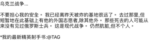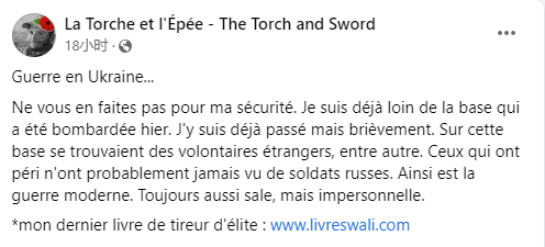 就在18小時前,瓦力的個人社交媒體發佈消息説:“不要擔心我的安全,我已經離昨天被炸的基地很遠了,我之前確實去過基地,但是不久就離開了。在這個基地裏都是外國來的志願者,那些人都沒見到俄軍士兵的面就死了,現代戰爭就是這樣。”