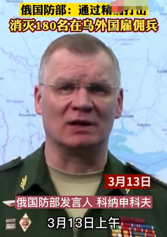 3月13日上午,俄羅斯國防部在新聞發佈會上説俄軍在當天用高精度武器遠程攻擊了位於斯卡里奇村的雅沃爾斯基軍事訓練場,烏克蘭當局在該訓練基地設置了一個“國際縱隊志願者”們的訓練和協調點,俄方打擊造成180名外國僱傭兵傷亡。