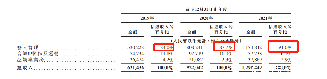 投入低、產出高的偶像產業,讓樂華娛樂的主營業務在過去三年裏實現了穩定發展。2019年至2021年,樂華娛樂藝人管理業務(包含藝人代言、參與商業活動、參演影視作品等帶來的收入)產生的收入分別為5.3億元、8.08億元及11.74億元,在總營收中的佔比分別為84%、87%及91%,這項業務的毛利率更是高達50%左右。