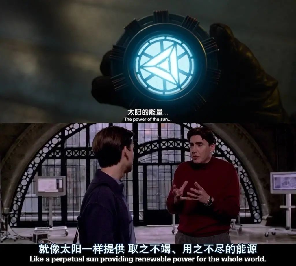 《蜘蛛俠2》中他沒造出來的**“太陽能量”**,被鋼鐵俠的反應堆證實可以實現。