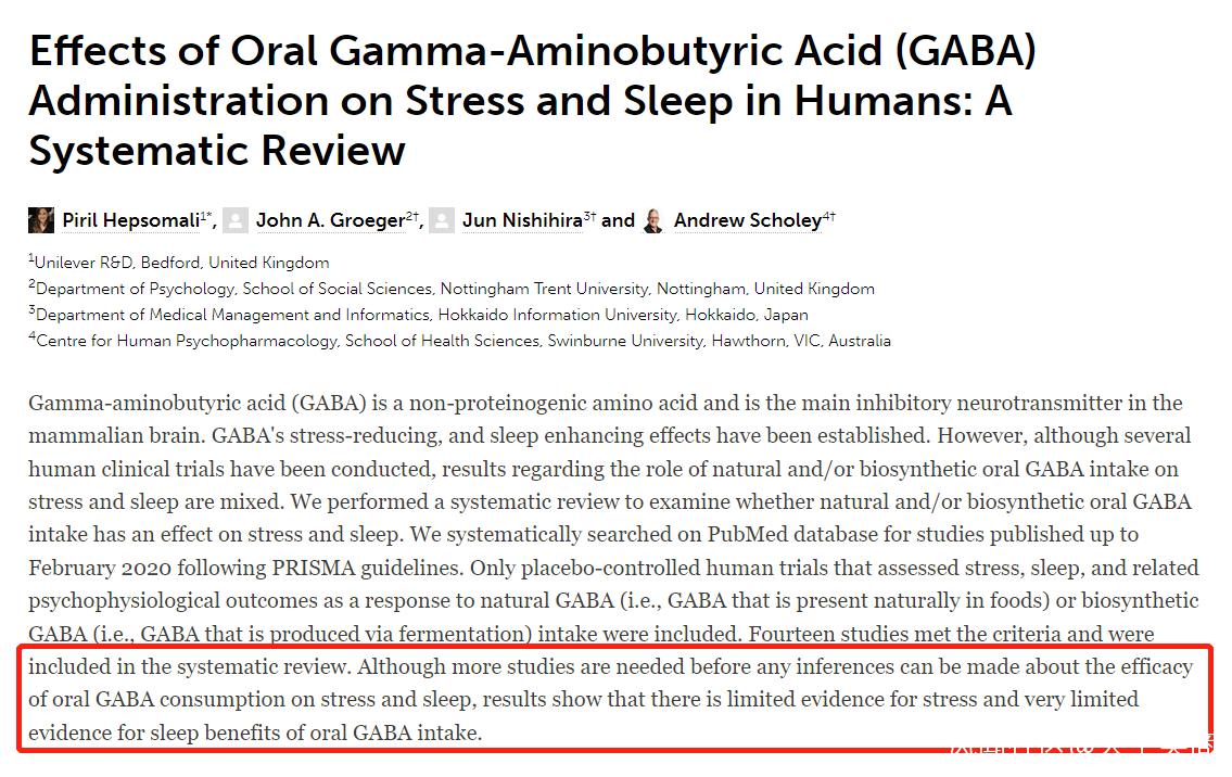 另外,在相關學術平台搜索GABA的研究成果可見,2020年8月,NottinghamTrentUniversity的研究人員發表了一篇系統綜述,回顧了往年發表的關於口服GABA對焦慮和失眠影響的一些研究,結論是limited****evidence(“證據不足”)。