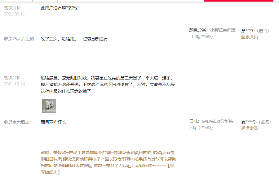 其實在翻找評論區時不難發現,有部分網友在產品評價中提出了質疑,黑零旗艦店客服則在回覆中表示,“產品主要是輔助類,建議長期食用,並且建議睡前遠離電子產品”。