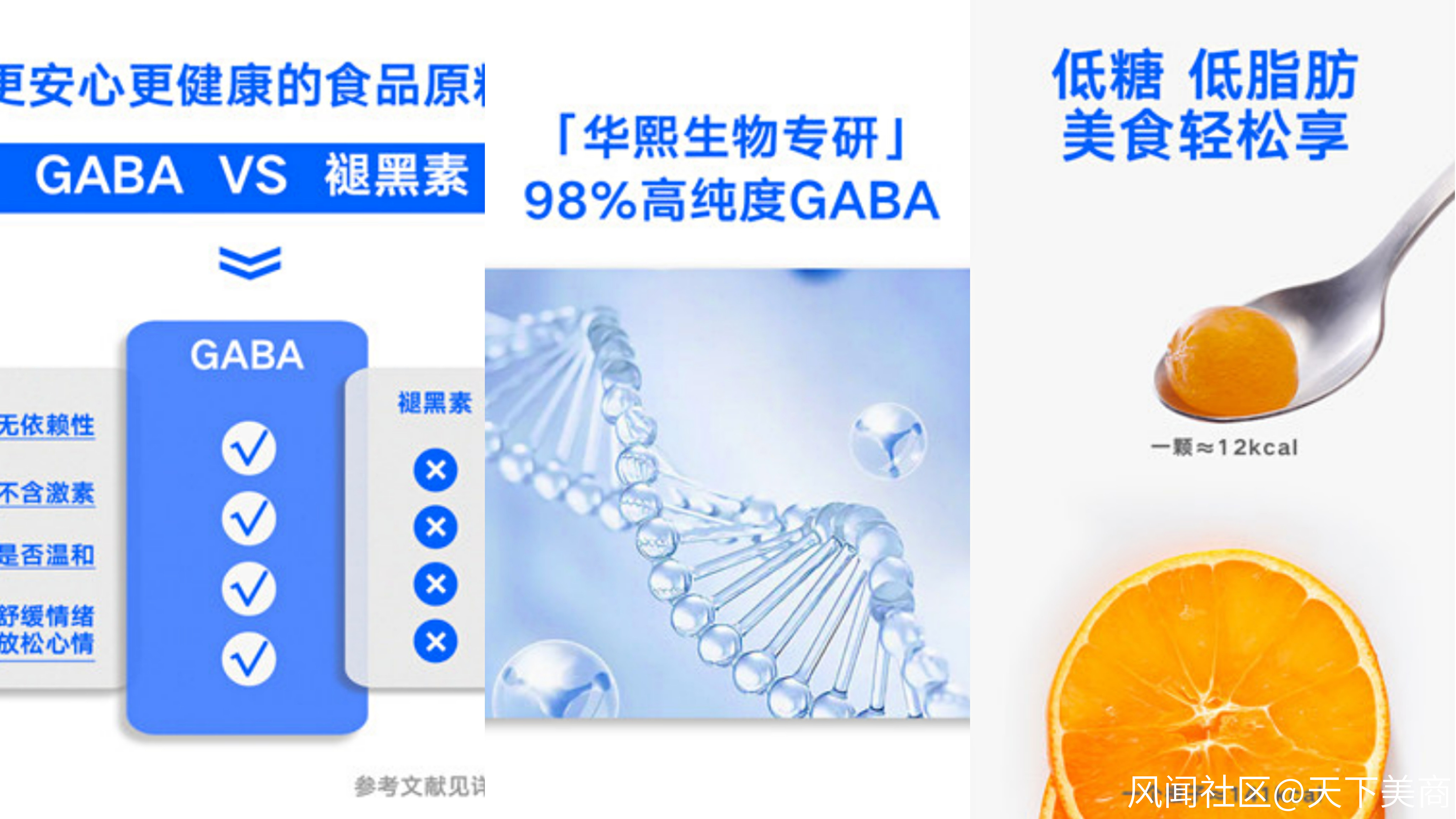 “比褪黑素更安心更健康的食品原料”、“華熙生物專研【98%高純度GABA】”、“低糖、低脂肪、美食輕鬆享”,三句標語分別針對三大要點:對標褪黑素、亮出華熙生物的高科技招牌、切中當代人養生喜低糖的飲食習慣,完美擊中消費者的消費需求。