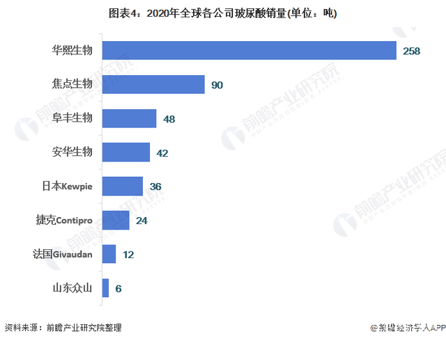 一直以來,華熙生物因其巨大的玻尿酸原料供應而聞名,據醫美查顯示,中國是全球最大的透明質酸原料生產銷售國,2020年中國透明質酸原料的總銷量佔全球總銷量的81.6%,中國企業均位列全球銷量排名榜首。我國的華熙生物是全球最大的玻尿酸銷售企業,2020年華熙生物的玻尿酸銷量達到258噸。