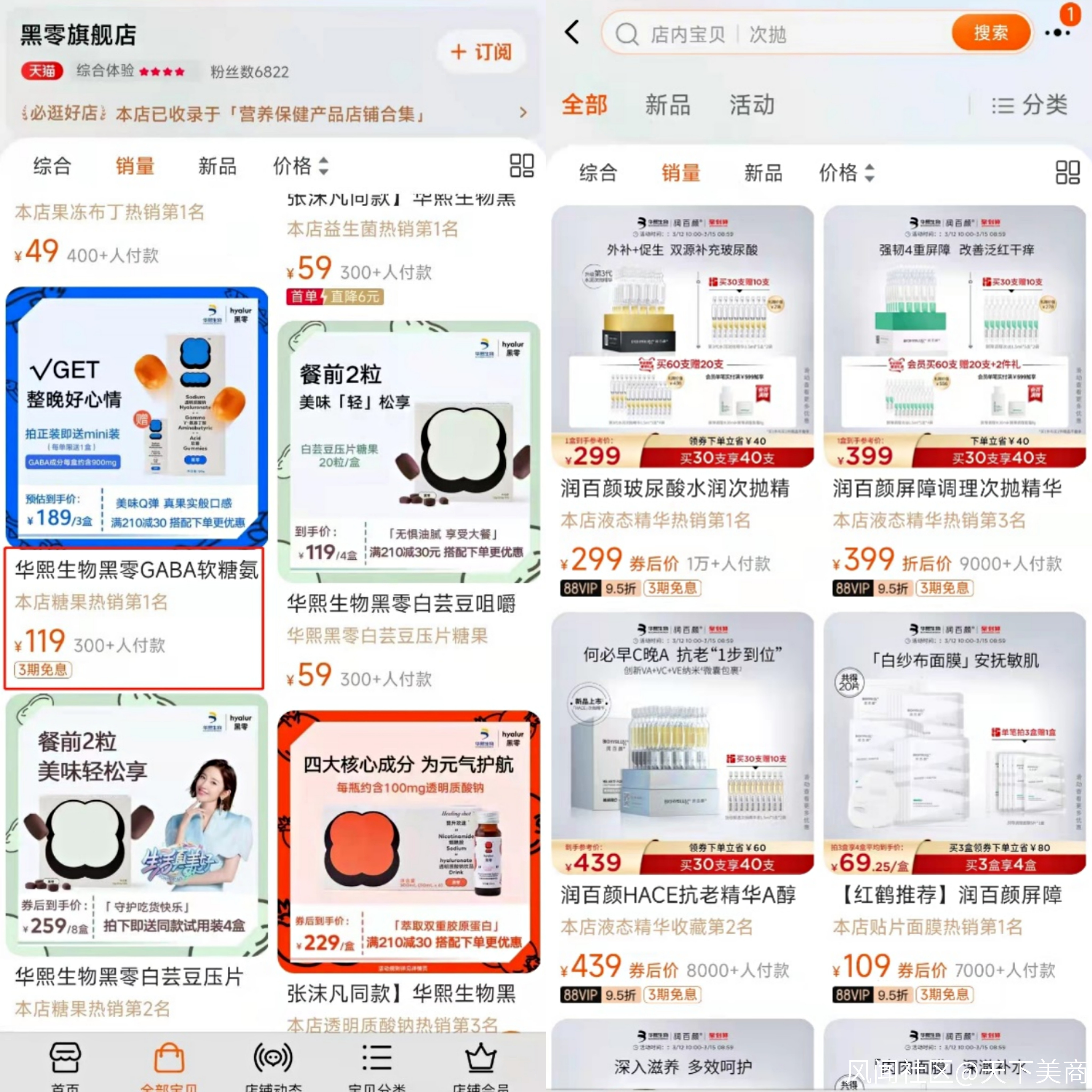 淘寶華熙生物旗下黑零旗艦店產品頁面截圖vs淘寶華熙生物旗下潤百顏旗艦店產品頁面截圖