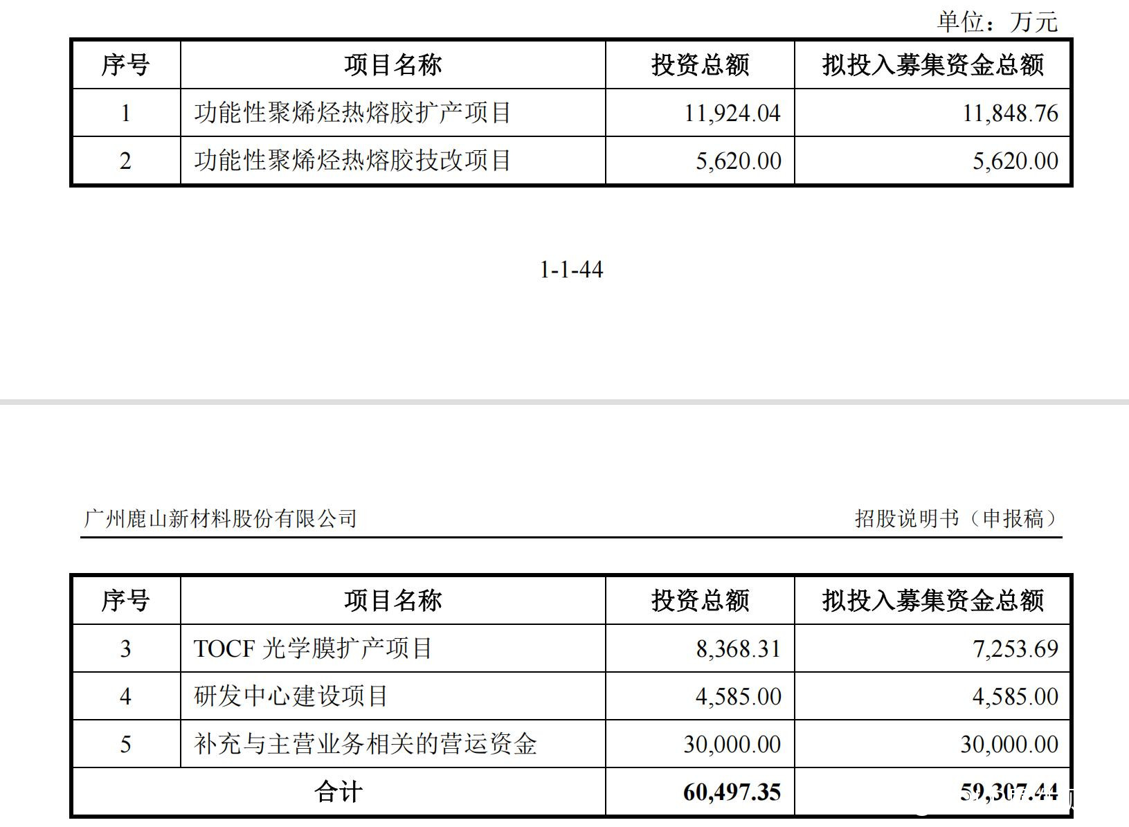 為了防範風險,增強公司核心競爭力,鹿山新材則將此次上市募集的資金用於投資功能性聚烯烴熱熔膠擴產項目、功能性聚烯烴熱熔膠技改項目、TOCF 光學膜擴產項目、研發中心建設項目。