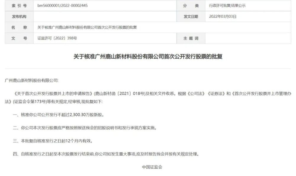 2022年3月3日,據證監會網站顯示,中國證監會同意上交所主板企業廣州鹿山新材料股份有限公司首次公開發行股票的批覆,這意味着鹿山新材的IPO之路即將畫上了圓滿句號。