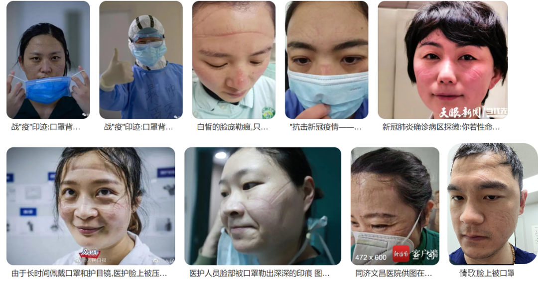 4小時到了,我結束了工作,脱了防護服,腦門上都是N95的印子。這時我又想起了那些新聞裏的姑娘們,穿24小時防護服之後腦袋上的血印子,比我這嚴重多了。