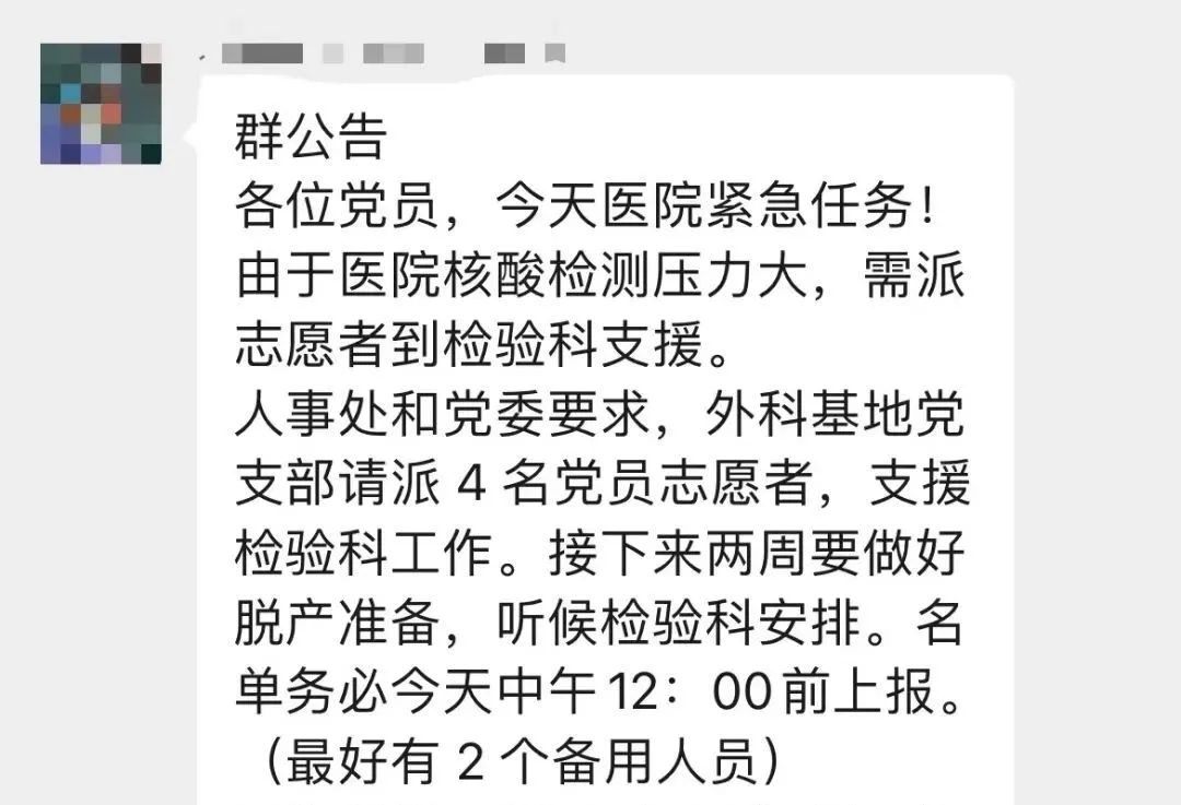 我們規培基地黨支部的羣裏,支部書記突然發了一則通知,説是醫院招募志願者,參加核酸檢測工作。