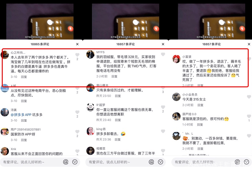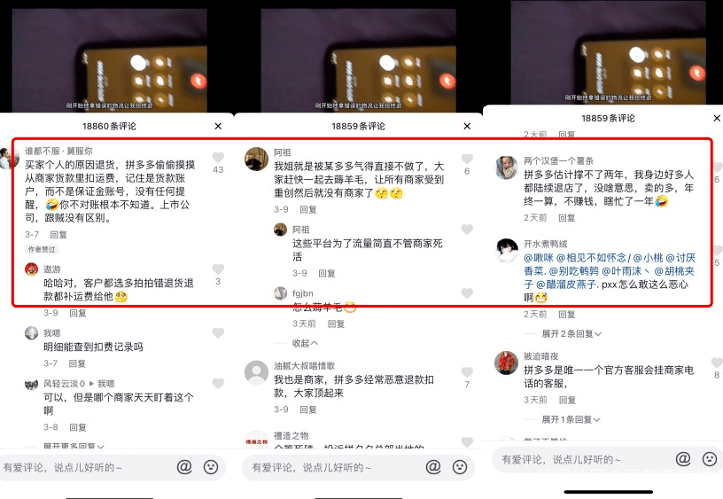 而在翻看視頻留言過程中,筆者發現,碰到類似女主播LILCC這樣經歷的拼多多賣家,並不在少數。