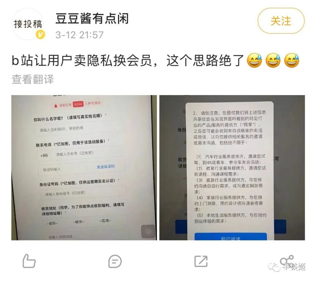 有微博網友表示,B站讓用户賣隱私來換大會員,黃豆流汗。