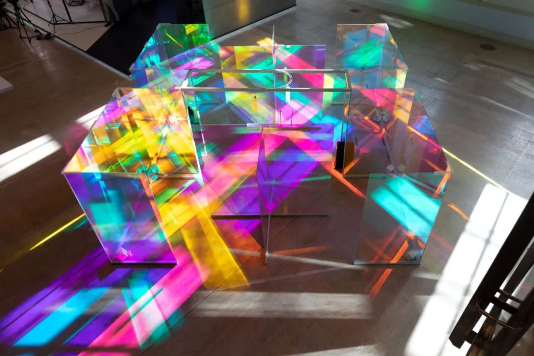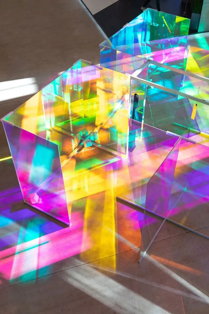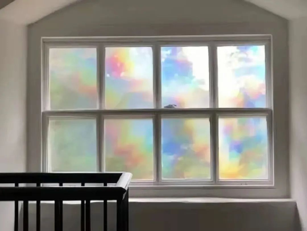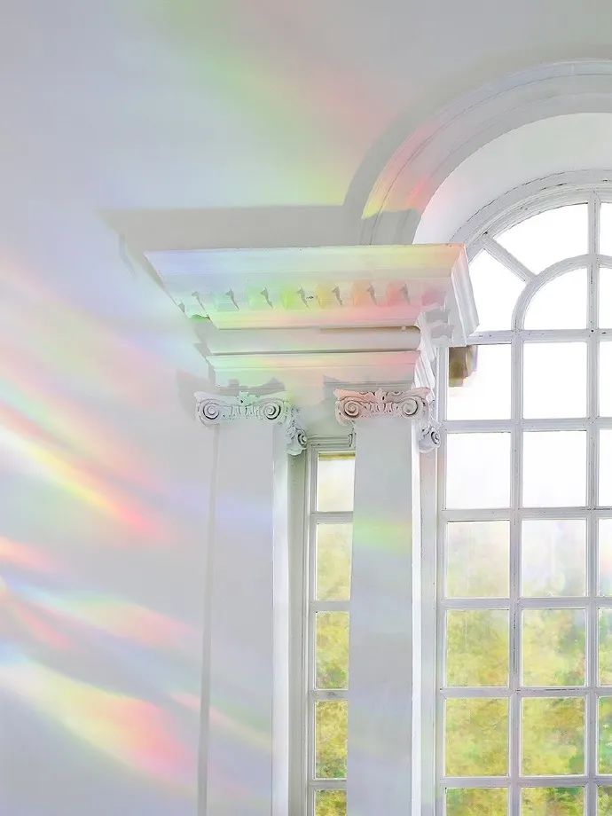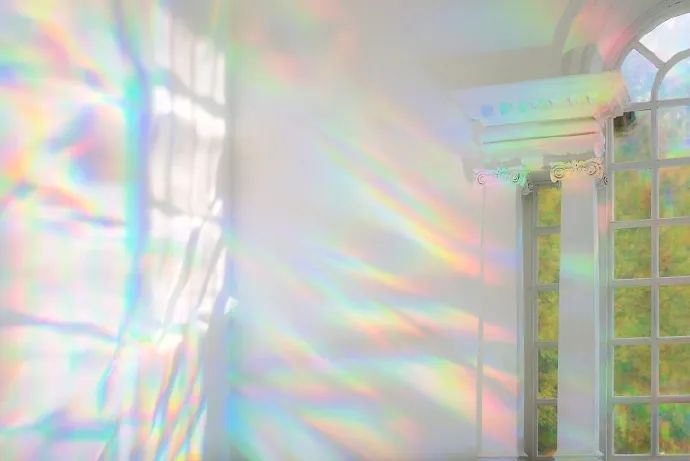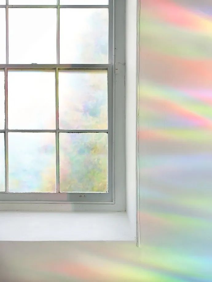 她通過在窗户上放置衍射膜,使進入的光在整個空間裏形成無數的彩虹光譜。