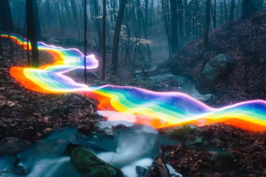 在冬天,從加州搬回故鄉新英格蘭的路上,受寒冷的藍色夜晚啓發,他們開始嘗試在長曝光攝影裏玩彩虹光效。