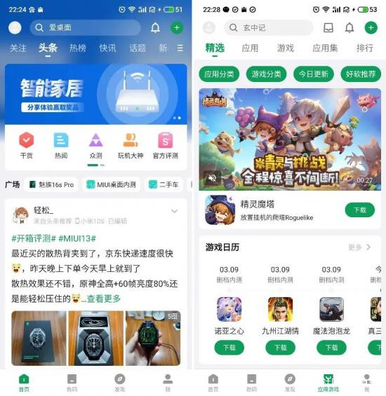 ▲手機自帶的應用商店下載的應用功能受限(左圖為手機自帶應用商店下載安裝的酷安打開界面,右圖為酷安官網下載安裝的酷安打開界面)