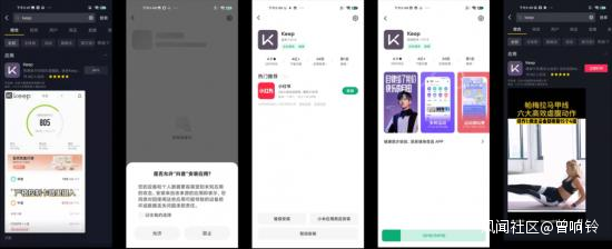 經過測試,用小米手機在抖音上下載Keep,安裝過程中首先會彈出“是否允許抖音安裝應用”的提醒,允許之後,又彈出一個頁面,出現三個選項,“繼續安裝”“小米應用商店安裝”“取消安裝”。在點擊“小米應用商店安裝”後,跳轉到小米應用商店Keep的下載頁面,無需進行任何操作即可自動下載安裝。在安裝完成之後,本刊又返回到之前下載Keep的抖音,發現原本Keep下載頁面中的“下載”按鈕變成“立即打開”按鈕,這意味着在抖音下載的Keep和在小米應用商店下載的Keep並沒有任何差別。