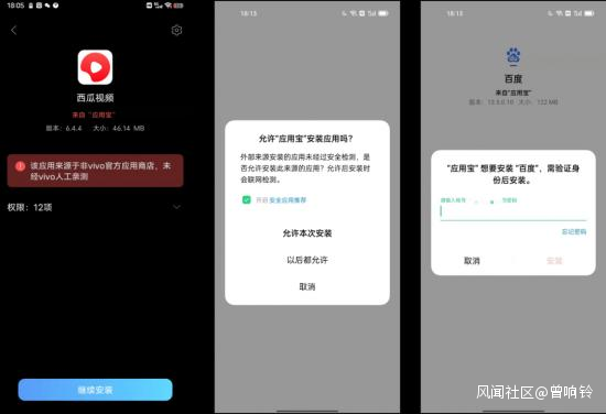 例如使用應用寶下載西瓜視頻或百度,vivo手機頁面會彈出提醒:“該應用來源於非vivo官方應用商店,未經vivo人工親測”。而OPPO手機除了彈窗提醒“未經安全檢測”之外,還需要驗證OPPO賬號的密碼才可以安裝。