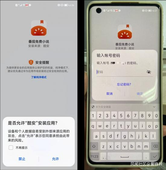 同樣,華為手機則會彈出“為提供更安全的應用服務以保護您的權益,純淨模式下,建議優先通過華為應用市場安裝經過安全檢測的應用”的提醒,還推薦了所謂的“瞭解純淨模式”和“通過華為應用市場安裝經過安全檢測的應用”的引流。即使用户堅持繼續下載,華為手機則會強制用户輸入賬號密碼才能安裝應用(密碼輸入頁面手機無法截屏)。
