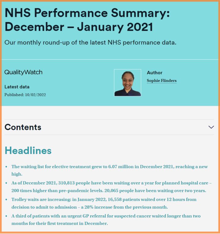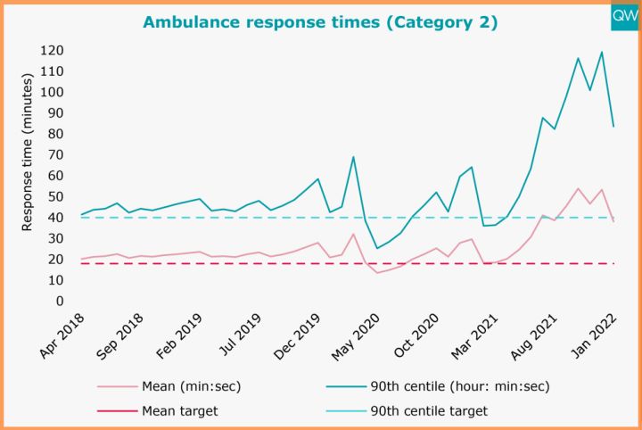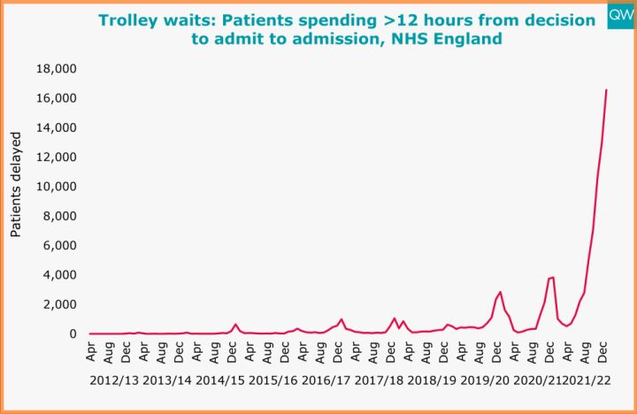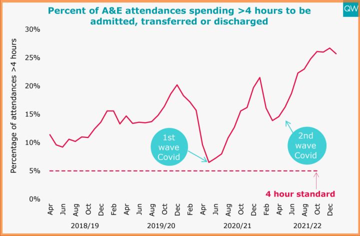 2021年12月到此年1月,分別有27%和26%的急診病人等候時間超過4小時,創下了NHS急診等候史上最爛記錄;