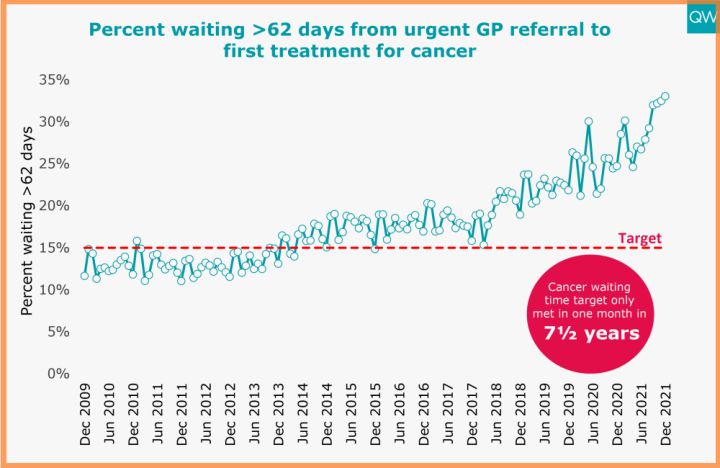 2021年12月,33%已得到GP緊急轉診的癌症患者,接受首次癌症治療的等待時間超過兩個月,這是NHS有記錄以來最高的拖延比例~