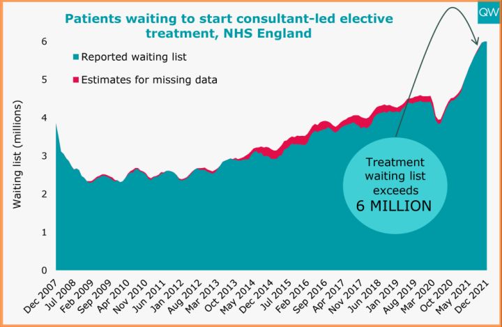 - 2021年12月,NHS擇期治療排隊人數創下歷史新高,達到607萬人;