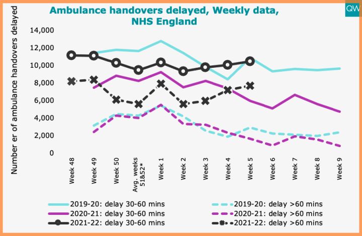 2022年第五週,NHS共發生約1.8萬起救護車交接延誤超過半小時的事故,佔總數的21%;