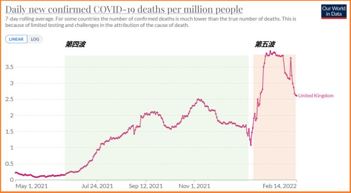 最後,英國第四波(Delta)和第五波(Omicron)爆發,死亡人數PK圖,