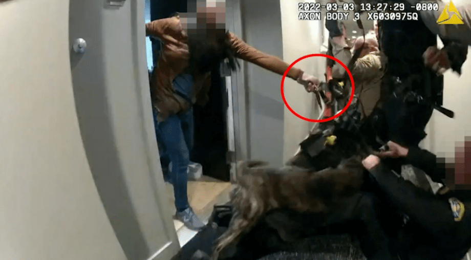 8名荷槍實彈的警察及一條警犬趕至,破門而入,向李豔射擊沙袋槍。