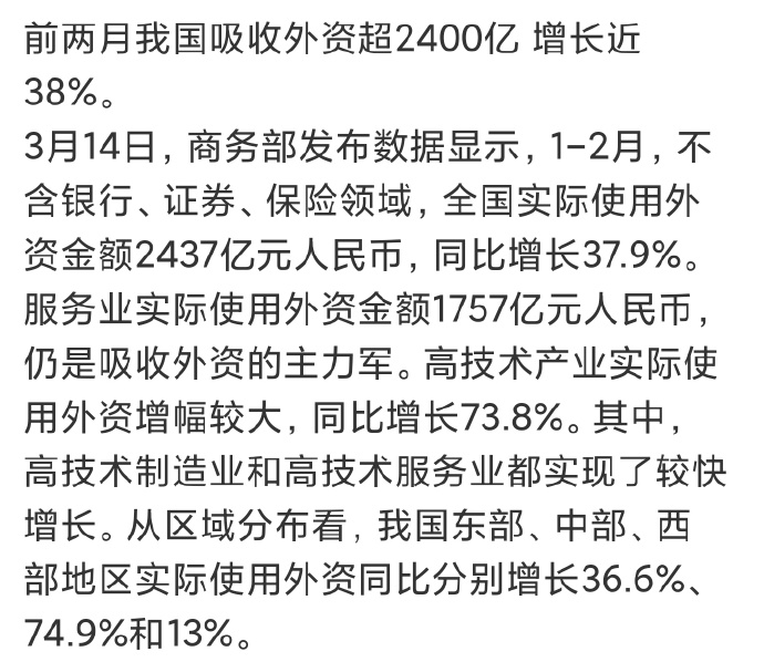 1. 今年前兩月實際使用外資2437億元增37.9%,合379億美元增45.2%。2021年增30%多是恢復,但是2019年前兩月就是1471億合217億美元,三年下來明顯大幅增長約70%。外資看好中國市場的能力是肯定的。