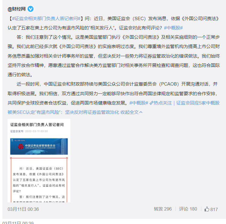 儘管我國證監會表示“尊重境外監管機構為提高上市公司財務信息質量加強對相關會計事務所的監管”,但投資者依然擔心這些企業有退市的風險,股價應聲大跌: