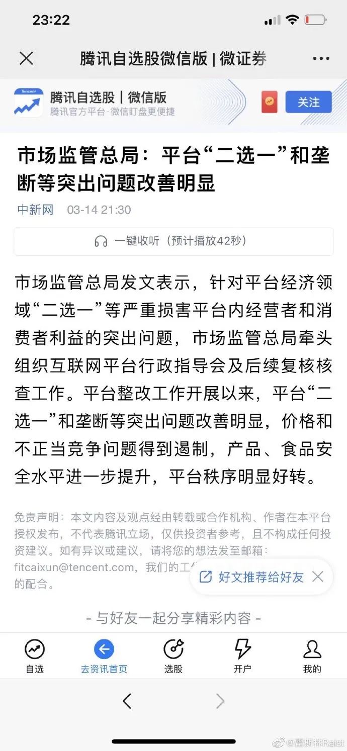 先是強調不是不要市場經濟,然後強調民營經濟很重要,昨天又表示二選一改善了反壟斷明顯改善,暗示告一段落了。